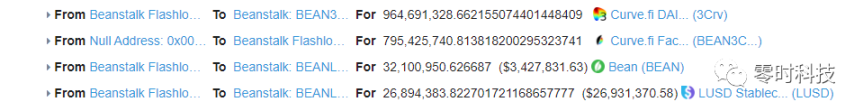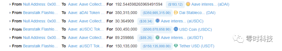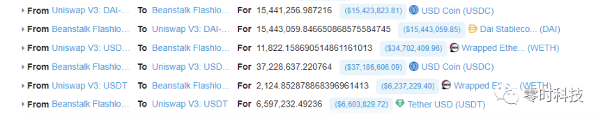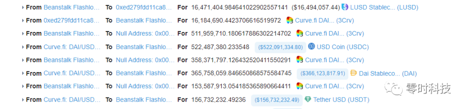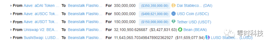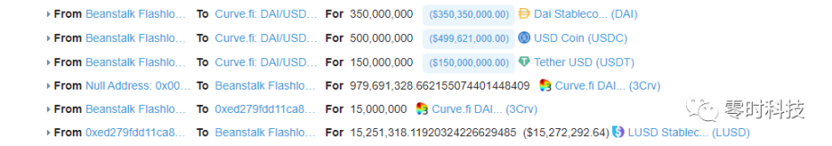 攻击者通过闪电贷分别从Aave、Uniswap V2、SushiSwap 中获取了大额资金作为后续攻击的准备工作,从下图可知,攻击者共计闪电贷金额:350,000,000 枚 DAI,500,000,000 枚 USDC ,150,000,000 枚 USDT ,32,100,950 枚 BEAN 和 11,643,065 枚 LUSD 。