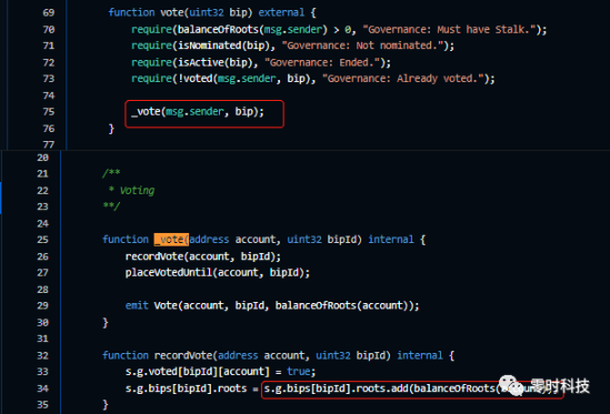 合约中正常是通过vote方法来投票提案,这里调用了recordVote方法来记录选票,选票由balanceOfRoots(account)方法计算,也就是用户的资金地址,而攻击者通过闪电贷资金兑换得到了可投票的Token,所以这里攻击者可利用大量投票权优势使自己的提案通过。