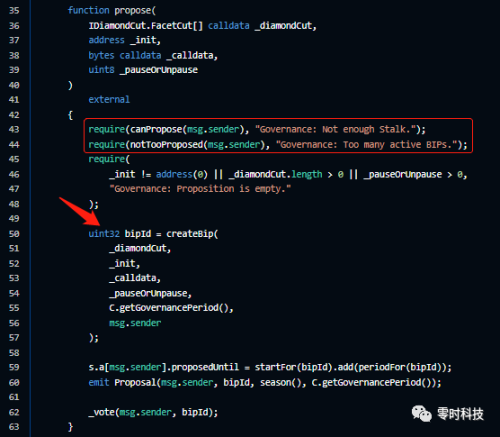 攻击获利交易前夕,攻击者通过GovernanceFacet合约propose方法发起提案,生成该提案id,并且这里判断了攻击者是否有发起提案的资格和提案数量判断条件,由于攻击者通过之前操作质押了资金,所以这里条件满足,可正常发起提案。