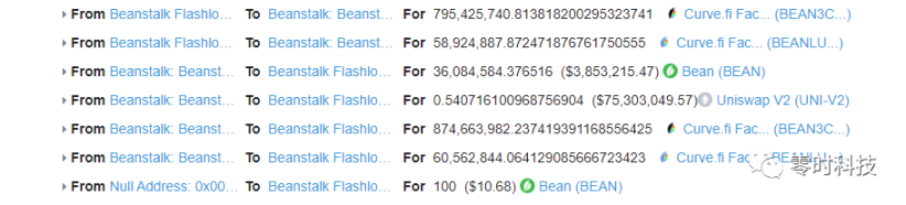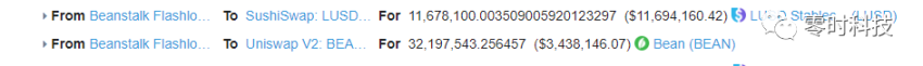 接下来攻击者将 964,691,328 枚 3Crv 代币兑换为 795,425,740 枚 BEAN3CRV-f 用于投票,将 32,100,950 枚 BEAN 和 26,894,383 枚 LUSD 添加至流动性得到 58,924,887 枚 BEANLUSD-f 流动性代币