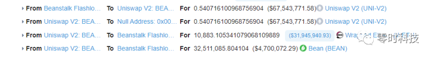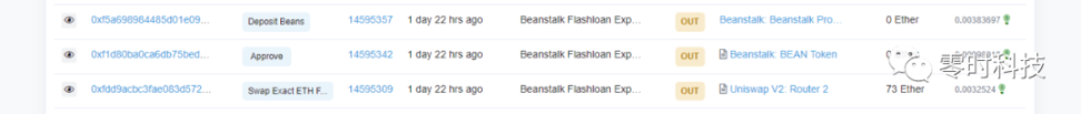 对攻击者合约地址所发生的交易进行分析发现在主要攻击交易 0xcd3146 发生的前一天,攻击者通过Uniswap 去中心化交易所将 73 eth 兑换成了BEAN ,随后将BEAN 资金存入Beanstalk 合约(为了获取提案权)