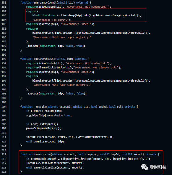 通过合约代码可以明确,getGovernanceEmergencyPeriod()方法返回时间为1天期限,也就是说emergencyCommit方法判断中,只要提案时间大于一天,则该方法可成功调用,由于攻击者已通过闪电贷资金投票恶意提案,所以这里emergencyCommit可成功执行并铸币。
