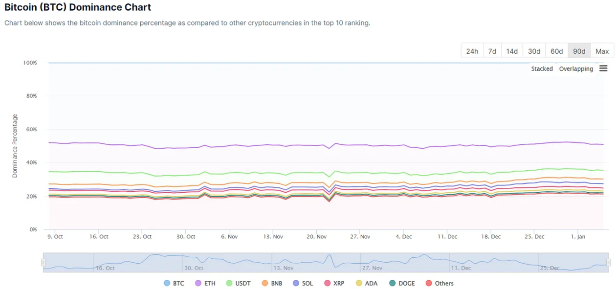 比特币 NFT 的出现和 L2 的发展促成了比特币在 2023 年的主导地位,从 38% 的市场主导地位上升到去年底的 50%。而且,当比特币 L2 完全发展起来时,比特币的市场领导地位仍可能进一步上升。