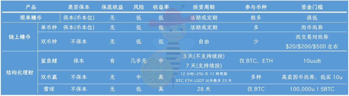 双币赢的收益率和风险比较高,产品更复杂一些,支持的周期和代币更多,更像是期权交易产品。