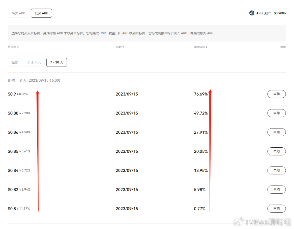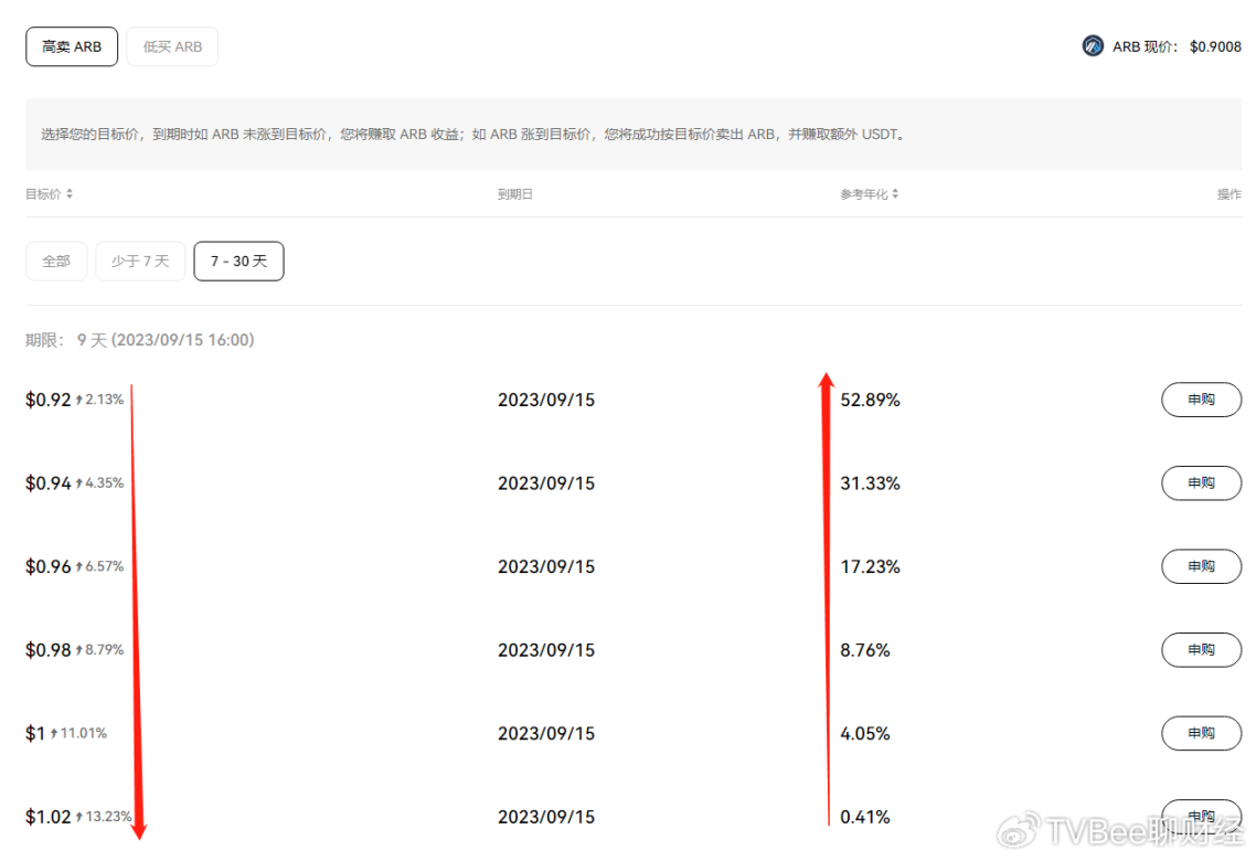 随着某种代币价格的波动,该代币的欧易双币赢产品的收益率是波动的。并且有些产品会自动下架和上架。例如,ARB 从\(0.85 上涨到\)0.89,那么目标价格 $0.89 的高卖 ARB 产品会自动下架。
