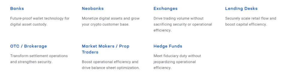 客户见上图,主要包括银行、金融科技公司、交易所、流动性提供商、场外交易商和对冲基金等,主要业务是构建安全基础设施和托管服务,帮助客户安全地管理各种产品和服务的数字资产。