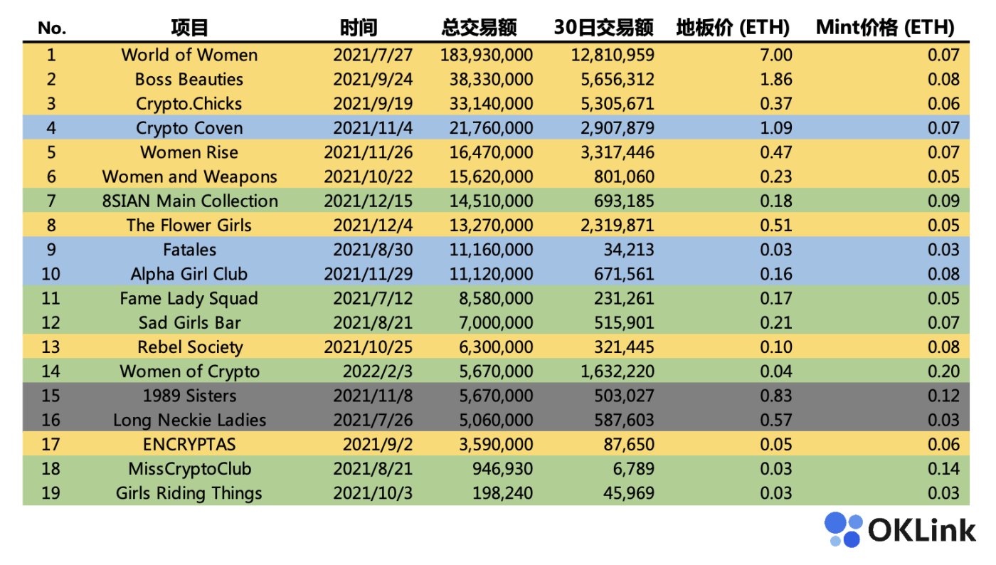 从规模来看,即使是在女性NFT项目中的龙头项目World of Women,其发展了半年多的总交易额仍未超过2亿美元,而近30日的交易额在OKLink NFT排行榜上排名仅35位。