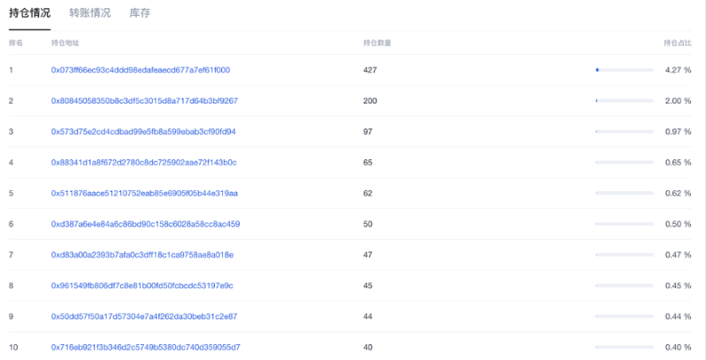 排名前10的地址持有1,077个WoW,其中最多的地址持有427个WoW。