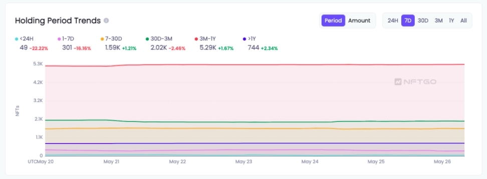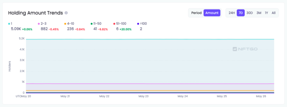 此外,我们还将“持有数量/时间分布图”(Holding Amount/Period Distribution)由饼状图改为了折线图,帮助用户分析不同时间序列上的持有者趋势变化。比方说,假设一个项目有很多长期用户,项目的发展趋势也整体向好,那么它的长期价值就可能比较稳定。Bored Ape Yacht Club ; 数据来源:NFTGo.ioBored Ape Yacht Club ; 数据来源:NFTGo.io