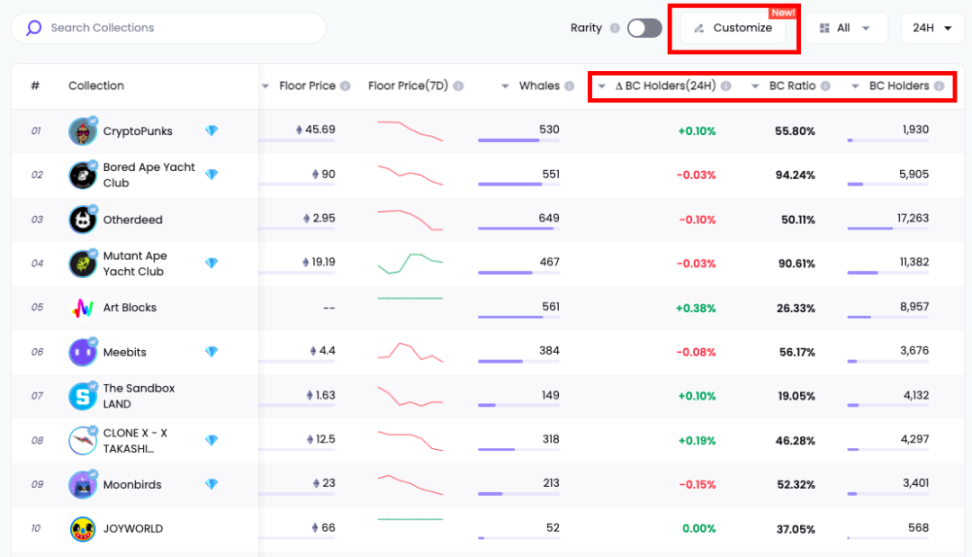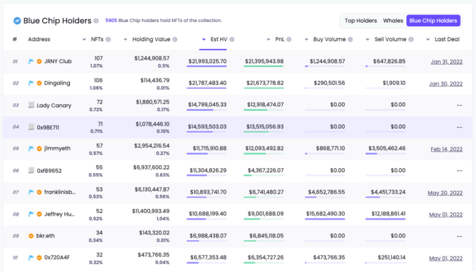 为了给用户带来更加直观的交互体验,我们推出了升级版持有者图表,新添“蓝筹项目持有者”板块,方便用户在同一界面内综合分析巨鲸、蓝筹项目持有者及一般持有者数据。Bored Ape Yacht Club ; 数据来源:NFTGo.io