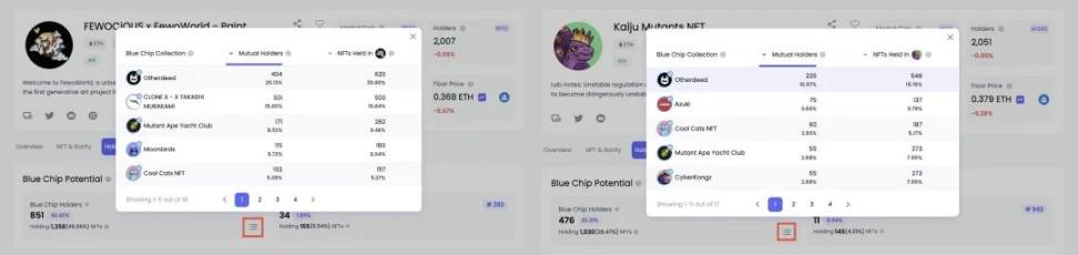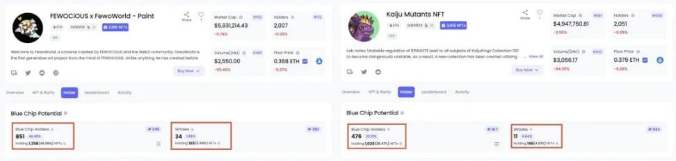蓝筹项目由NFTGo团队筛选,主要依据以下两条原则:1. 全时段交易量位列NFTGo站内Collection前列,且在过去一个月中保持较高地板价2. 二级分类领域中的领军项目,例如NFT实用性及PASS领域的PROOF Collective,CC0协议中的Nouns,元宇宙领域中的The Sandbox LAND或Decentraland LANDhttps://nftgo.notion.site/Blue-Chip-c53472fa68c845e29835cf683955fa4eNFTGo的Analytics/Overview Page新增了“蓝筹指数”板块,加权计算了蓝筹项目的市值,从而评估蓝筹NFT的市场表现。除了“蓝筹指数”板块,Analytics/Top Collection Page 添加了新的数据指标,从而统计蓝筹项目持有者的数量及百分点变动,评估不同Collection的蓝筹比率,并且可以一键排名,查看最高蓝筹率的项目。*注:点击“Customize”可在列表中显示蓝筹指标。为方便用户快速识别,我们为蓝筹项目设置了特殊标记。通过计算“蓝筹项目持有者”和“巨鲸”两个指标,我们能够初步预判一个Collection是否有成为蓝筹项目的潜力。如果想要更加精准的预测,还可以将这Collection的持有者与蓝筹项目的持有者进行比对,分析两个Collection中是否存在重合的持有者。打个比方,如果你正在FEWOCiOUS x FewoWorld和Kaiju Mutants NFT两个项目之间犹豫不决,不知道该买哪一个。通过比对数据,我们不难看出,二者的持有者数量和地板价相差不大,但是FEWOCiOUS x FewoWorld的持有者中,蓝筹项目持有者(33.03%)和巨鲸(1.81%)占比明显更大,并且同时持有CLONE X、Cool Cats、The Sandbox等蓝筹项目的用户数量较Kaiju Mutants NFT相比也更多。持有者趋势指标(Holder Trends Metric)
