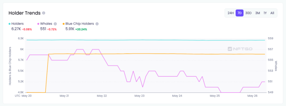 蓝筹指标(Blue-Chip Metric)和持有者趋势指标(Holder Trends Metric)是分析一个NFT项目是否成功的重要数据指标。通过NFTGo.io 网站内的蓝筹指标,辅之以巨鲸用户的数据(含鲸量),用户可以从多维层面了解不同Collection的持有者情况,合理做出投资决策。