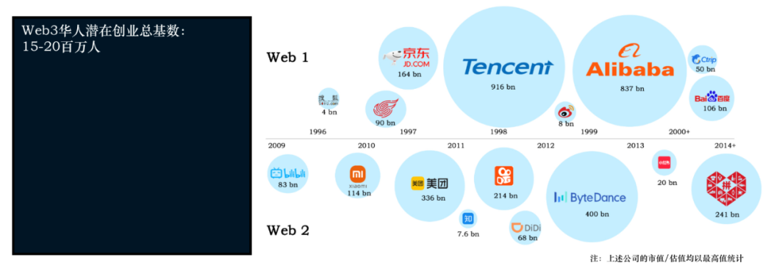 中国 00 年以来的面向消费者互联网产品的工程师红利,为整个 Web3 华人潜在创业人数奠定了约 15–20 百万人次的基数。