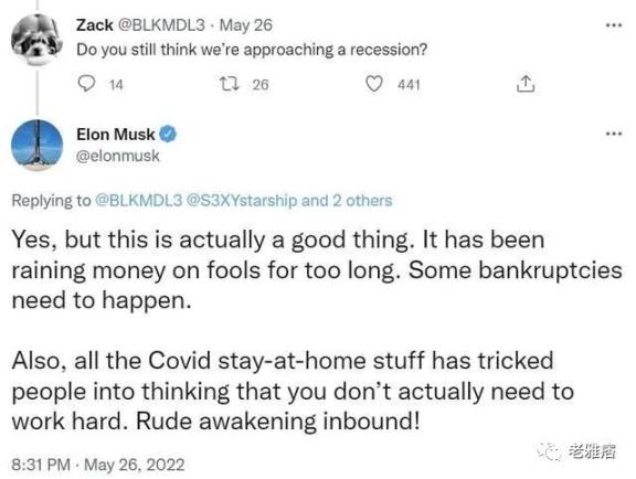 在推特回答有关“我们是否正在接近衰退”的问题时,他回答说:“是的。” 然而,马斯克指出,“这实际上是一件好事。”