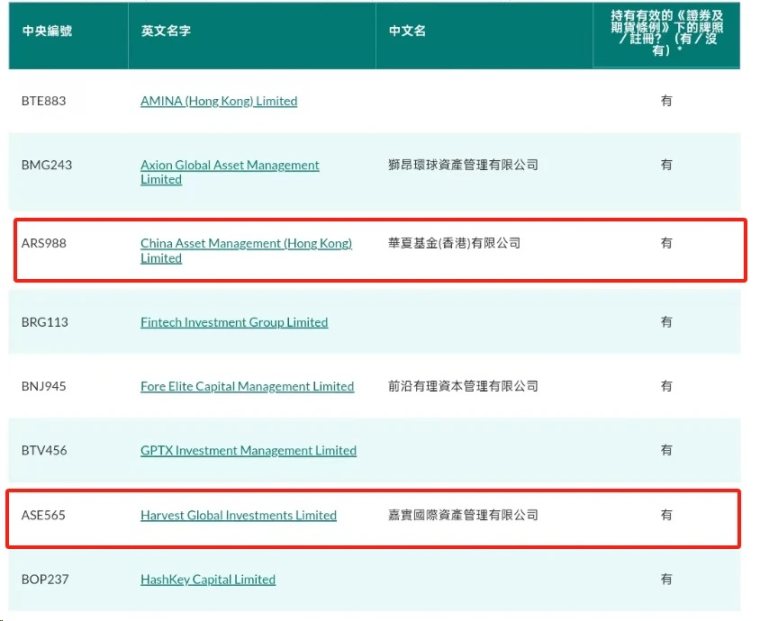 今天下午,嘉实国际、博时基金以及华夏基金(香港)相继宣布,已获香港证监会批准,可向投资者提供虚拟资产管理服务,计划发行能够投资于比特币现货和以太坊现货的 ETF 产品。