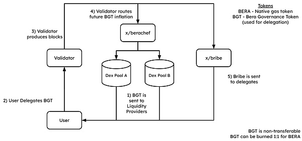 其中 BGT 是核心资产,不可转让、治理代币。持有者可以决定哪些流动性池可以接收 BGT 释放,类似于 CRV。BGT 同时也是验证者需要质押的权益代币。(验证者负责验证和确认交易,确保交易的正确性和区块链的安全性,并因此获得奖励)