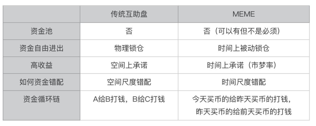 传统互助盘是一种空间尺度上的资金错配,所以它不需要形成资金池,大部分也不能自由进出款项,但必然要承诺高额收益。那为什么说 MEME 币是互助盘呢?