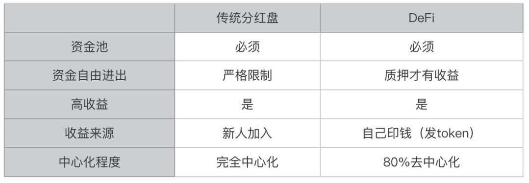 DeFi 是典型的分红盘,因为分红盘的基本逻辑就是“一次性投入一整笔资金,随时间线性分红获得收益”,是不是和上面的做法一模一样?我们同样有下图的对比: