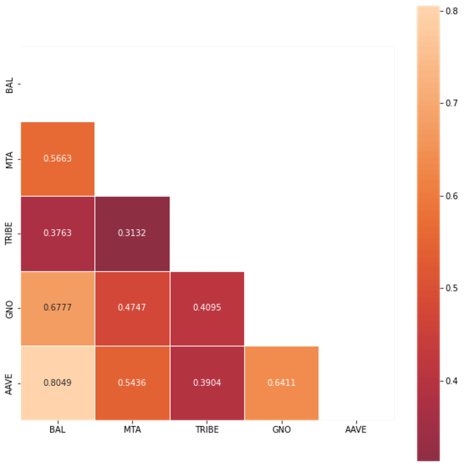 对于 Balancer 进行的财库互换,我们检查了 BAL、MTA、TRIBE、GNO、PRIME 和 AAVE 的每日价格数据,并比较了可追溯到 2021-04-03 的对数回报的相关性。结果如下面的相关矩阵所示: