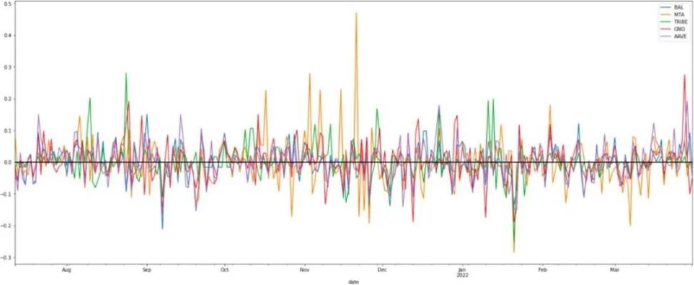 正如可追溯到 2021 年 8 月的上述资产对数回报的可视化所示,许多重大的负回报事件导致所有资产的回报急剧下降:2022 年 1 月下旬、2021 年 12 月上旬、2021 年 11 月下旬和 2021 年 9 月上旬,所有这些都是一项资产回报率急剧下降的显著例子,通常意味着 BalancerDAO 财库中存在的这个篮子中的其他资产也同样急剧下降。