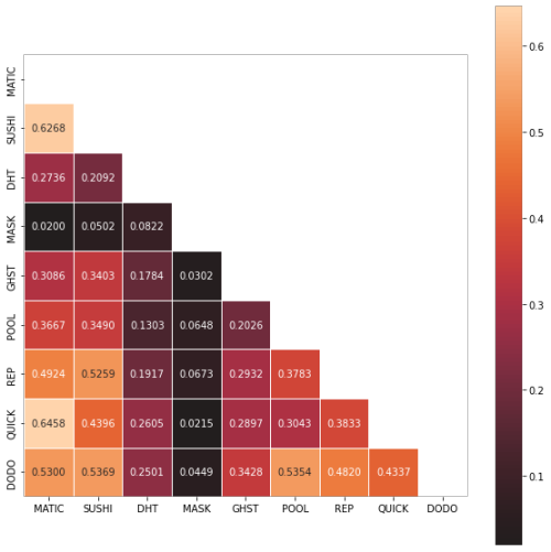 在 SocialFi 联盟的 15-20 个 Web3 组织中,选择了一篮子属于 DeFi 协议的治理代币。我们检查了 MATIC、SUSHI、DHT、MASK、GHST、POOL、REP、QUICK 和 DODO 的每日价格数据,并比较了可追溯到 2021-02-18 的对数回报中的相关性。公认的不那么糟糕的结果如下图所示:
