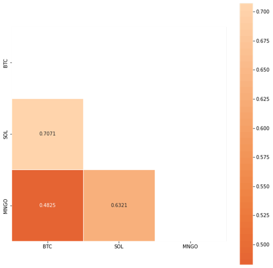 正如预期的那样,MNGO 与 SOL 的日回报率具有相当高的正相关性,相关系数为 0.7071,而与 BTC 的相关系数为 0.4825,相关系数不那么显着。如果 DAO 正在寻求投资组合多样化和风险缓解,它会希望选择 BTC 中相关性较低的资产。然而,鉴于 mSOL 产生了质押回报,看到 Mango 将其闲置资金投入使用是令人鼓舞的。