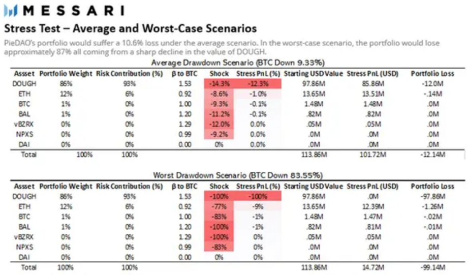 我们在这篇文章中多次提到主要的缩减保护和远离遵循特定回报模式的资产的多样化,这是一个原因。对 DAO 财库世界感兴趣的人的另一篇必读文章来自我们在 Messari 的朋友。他们对 PieDAO 的财库进行了压力测试,以应对 BTC 价格的重大下跌(由于它的受欢迎程度,捕捉行业整体情绪的能力,以及加密货币市场在急剧下降时与 BTC 更相关的趋势,所以用它作为整体加密货币市场指数的代理),并表明它对重大市场调整的准备非常不足。