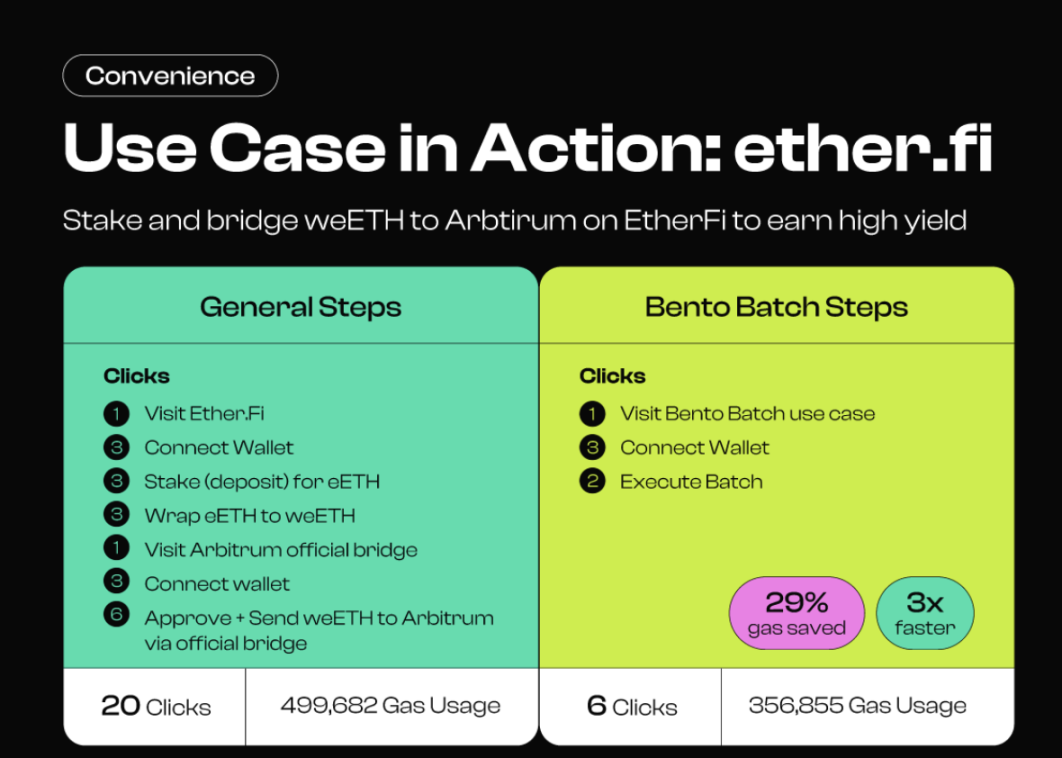 简化用户交互:通过链抽象,复杂的链上操作可以被打包成一个简单的授权请求,用户只需点击确认即可完成多步操作。以 Bento 为例,在与 Ether,fi 交互时,用户可能需要将代币转入流动性池、将 WEth 兑换 WeETH……而链抽象可以将这些操作整合在一起。