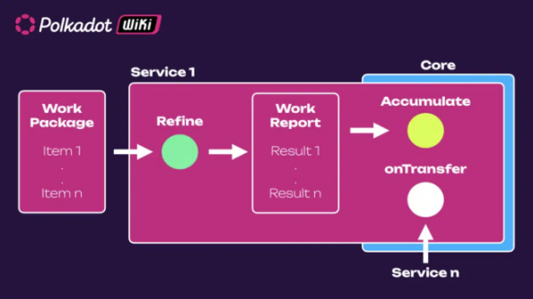 JAM 链提供以下三个关键服务入口,它们共同管理网络内的数据处理和集成工作流程:Refine:该功能处理无状态计算。它定义了 JAM 上特定 Rollup 服务所需的转换。从本质上讲,它为进一步处理数据做好准备。Accumulate:该功能从"精炼"阶段获取精炼输出,并将其折叠到整体服务状态中。可以把它想象成计算结果的累积。OnTransfer:该服务入口点处理从 JAM 系统内其他服务接收到的信息。它有助于在 JAM 上运行的不同服务之间进行通信和数据交换。在 JAM 中,工作包作为服务的输入,包含多个工作项。每个工作项都与反映其特定输入的服务相关联。对于平行链而言,这些工作包包含交易和其他区块链输入。JAM 的安全框架通过两个阶段的流程运行:Refine 接受工作项目并产生工作结果,随后传递给 Accumulate。这一顺序可确保工作项目被细化为连贯的工作结果,并反映出工作包内多个项目的成果。工作包可在指定时间段内使用特定的核心,以优化资源分配。图片来源:https://wiki.polkadot.network/docs/learn-jam-chain