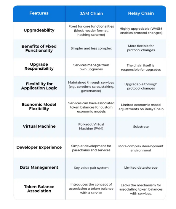 与基于 Substrate 的链不同,前者通常需要治理批准才能添加新的 pallet 模块,JAM 链在添加新服务时无需任何机构的批准或遵守治理机制。这种架构反映了智能合约链上常见的结构,其中服务代表状态的分区,每个分区都包含代码、余额和相关状态组件。
