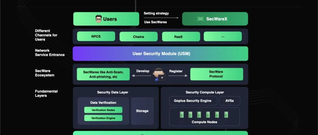 GoPlus 将自己定义为“一个开放、无需许可和用户驱动的 Web3 模块化用户安全层”。从 GoPlus 的网络架构来看,其核心组件是用户安全模块 (USM)。USM 被设计为 SDK 的形态,可以将各种安全服务集成到基础设施和 dApp 中,渗透到用户交互的各个环节。
