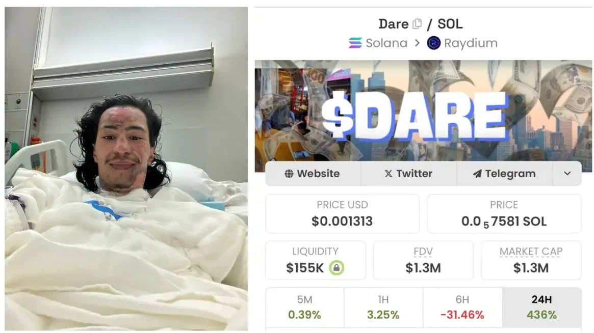 图片中的男人叫 Mikol,是最近推出的「真心话大冒险」(DARE)代币的创始人,他在发布代币时用烟花自焚,导致严重烧伤。