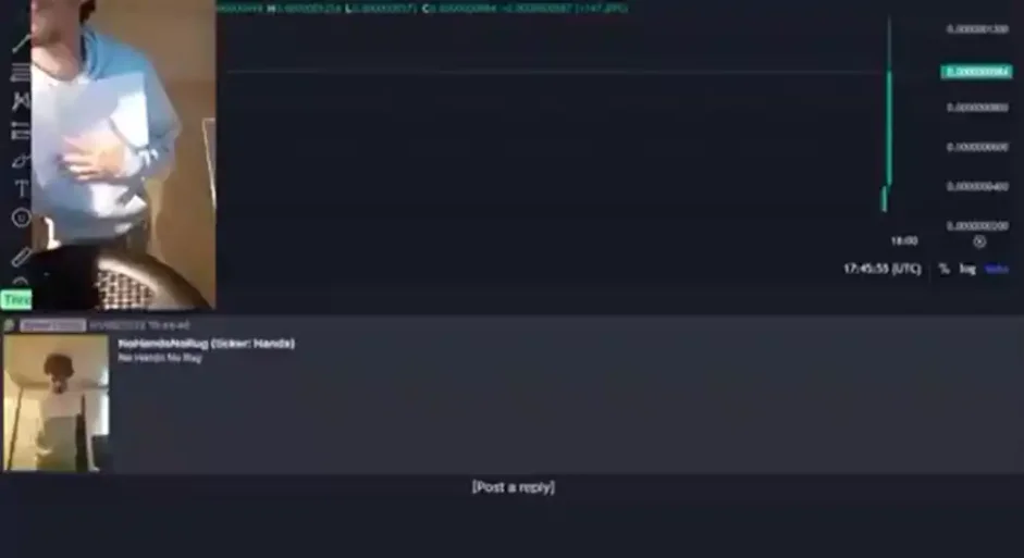 一个人创造了一个名为 HANDS 的代币,并用下巴夹住着一张纸,说「我没有手,我无法 rug。」
