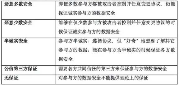 回顾联邦学习的起源,它同时具备两个动机:解决“联邦”场景下的方法框架问题,以及解决隐私保护问题。前面两节分别介绍框架部分的方法与局限性,本节介绍隐私保护中的数据安全部分,而模型安全部分则放到下一节介绍。需要指出的是,通常所谓的“数据不出门”是一个不够严谨的说法:它只是表明原始数据本身不会被传递。但出于“有用性”要求,要绝对防止信息泄露却并无可能[13];因此,在前面介绍的各种联邦学习方案中,与原始数据密切相关的信息不可避免要发送出去,从而使得攻击者或“诚实但好奇”的参与方有可能根据这些信息反推原始数据或提取与原始数据有关的信息,导致各种安全问题。因此,仍需对各个应用场景的安全需求进行分级,并根据实际需要和资源约束情况选择使用相应的安全协议。数据安全算法主要是各种多方安全计算(MPC)协议,实际应用中也有非MPC的协议。按照所能提供的安全保证,可以对这些方法作如图表 4所示的区分。接下来,我们按照安全保证级别从高到底分别介绍代表性的协议。