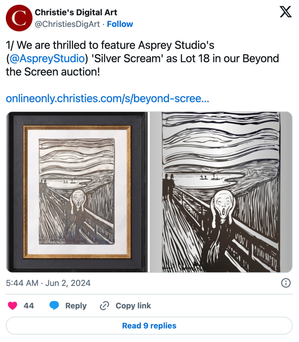 5 月 31 日,佳士得开启了 Beyond The Screen,这是一场 NFT 拍卖会,共展出 20 件拍品和各种类型的作品,除了一件罕见的 CryptoPunk 作品外,此次拍卖还包括两件比特币 Ordinals 艺术品。首先,是 Rutherford Chang 的 Ordinals 项目 “CENTS”,这件作品由 10,000 枚美国硬币冶炼并铸造成 68 磅重的铜块,然后以 3D 渲染的形式永久保存在比特币区块链上,并被铭刻为 Ordinals。与此同时,Asprey Studio 的 “Silver Scream” 开始以 10,000 美元的价格竞标 Edvard Munch 1895 年著名杰作 “The Scream” 的银质雕塑以及 5 月 21 日刻上的相应比特币 Ordinals。