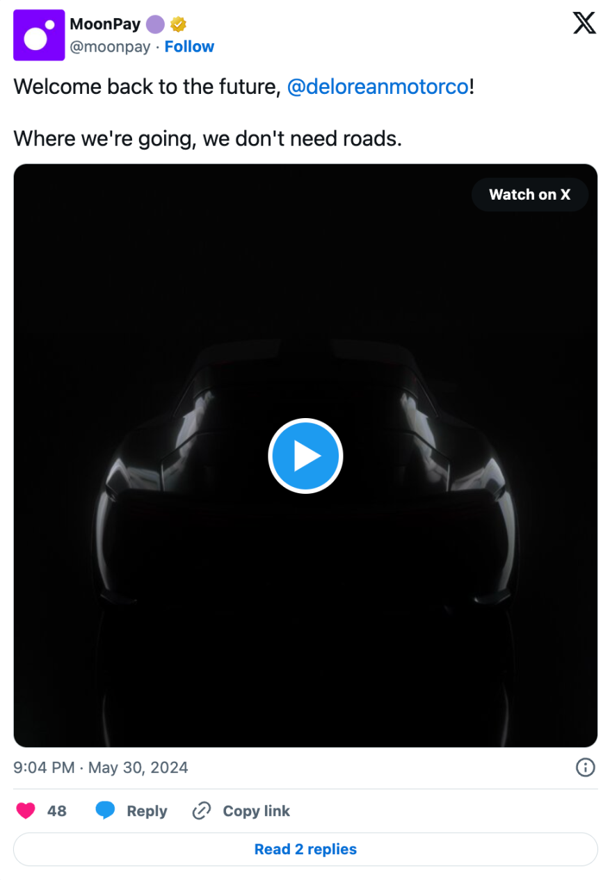 20 世纪 80 年代的跑车制造商 DeLorean 通过使其车辆登记可在链上转让,撼动了汽车市场,该汽车制造商与加密支付公司 MoonPay 合作,让客户以 NFT 的形式转移其购车预订。web3 市场计划于 2024 年晚些时候推出,汽车爱好者和买家很快就能在新的数字平台上交换他们的预订。