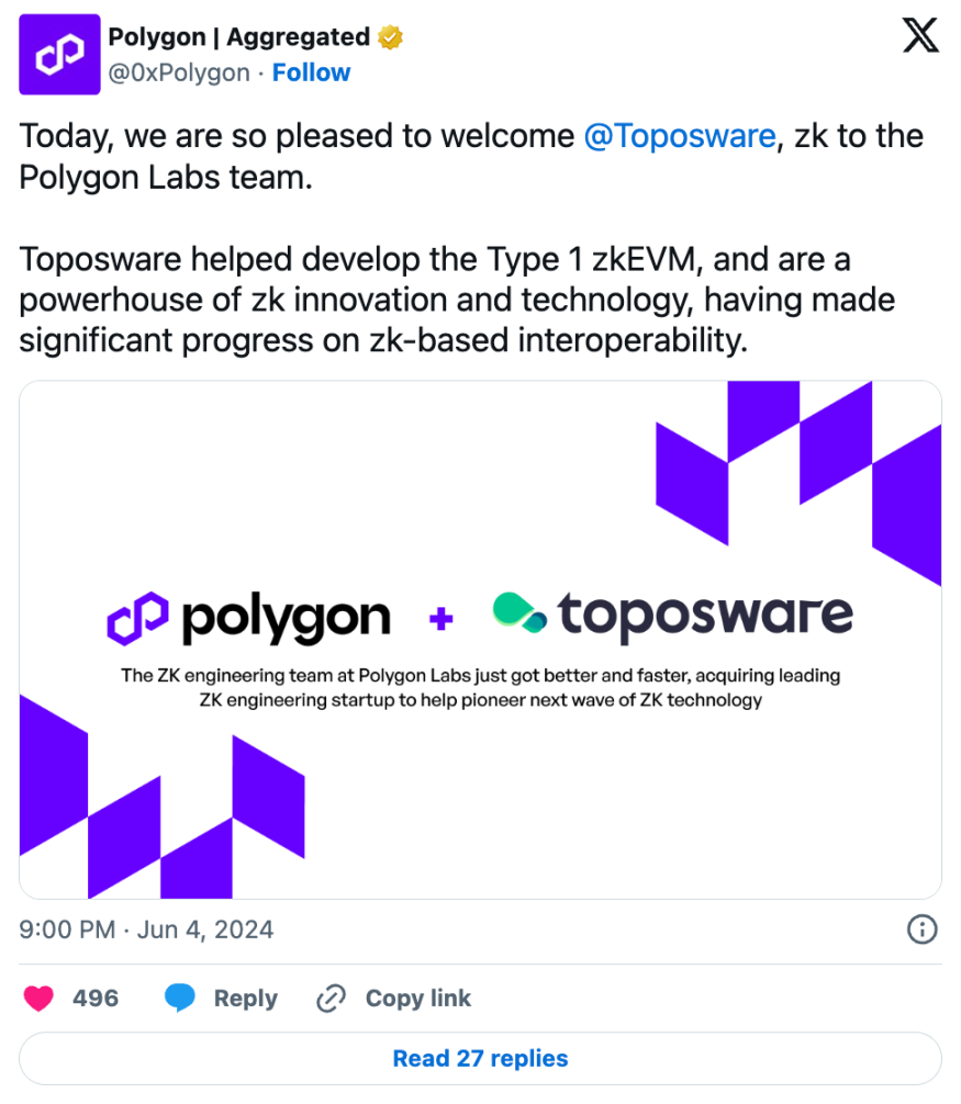 Polygon 收购 ZK 证明公司 Toposware领先的以太坊扩展器 Polygon 收购了零知识(ZK)证明解决方案构建商 Toposware。 Polygon 在一篇博客文章中表示,Toposware 团队正在与现有的 Polygon ZK 开发团队整合,以进一步推动所有技术方面的创新,包括 AggLayer、Polygon CDK 和 Polygon zkEVM。