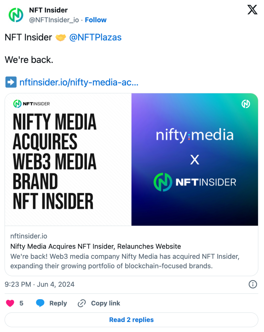Nifty Media 收购 web3 媒体品牌 NFT InsiderNifty Media 是 NFT Plazas 和其他热门网站背后的领先 NFT 新闻公司,现已收购 NFT Insider,后者是一个媒体平台,最初成立于 2021 年,旨在报道以游戏为重点的 WAX 区块链。 为了纪念此次收购,Nifty Media 重新推出了 NFT Insider 网站,并在社交媒体上宣布了这笔交易,得益于 Nifty Media 不断扩大的投资组合,此举可能会为 NFT 收藏者带来更全面的报道和更深入的见解。