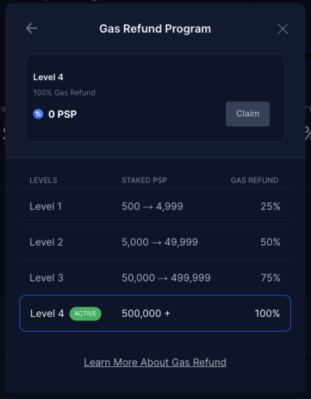 - 根据 2 月通过的提案,在平台上线 gas refund。根据用户质押的 PSP 数量,refund 被分为四个档: