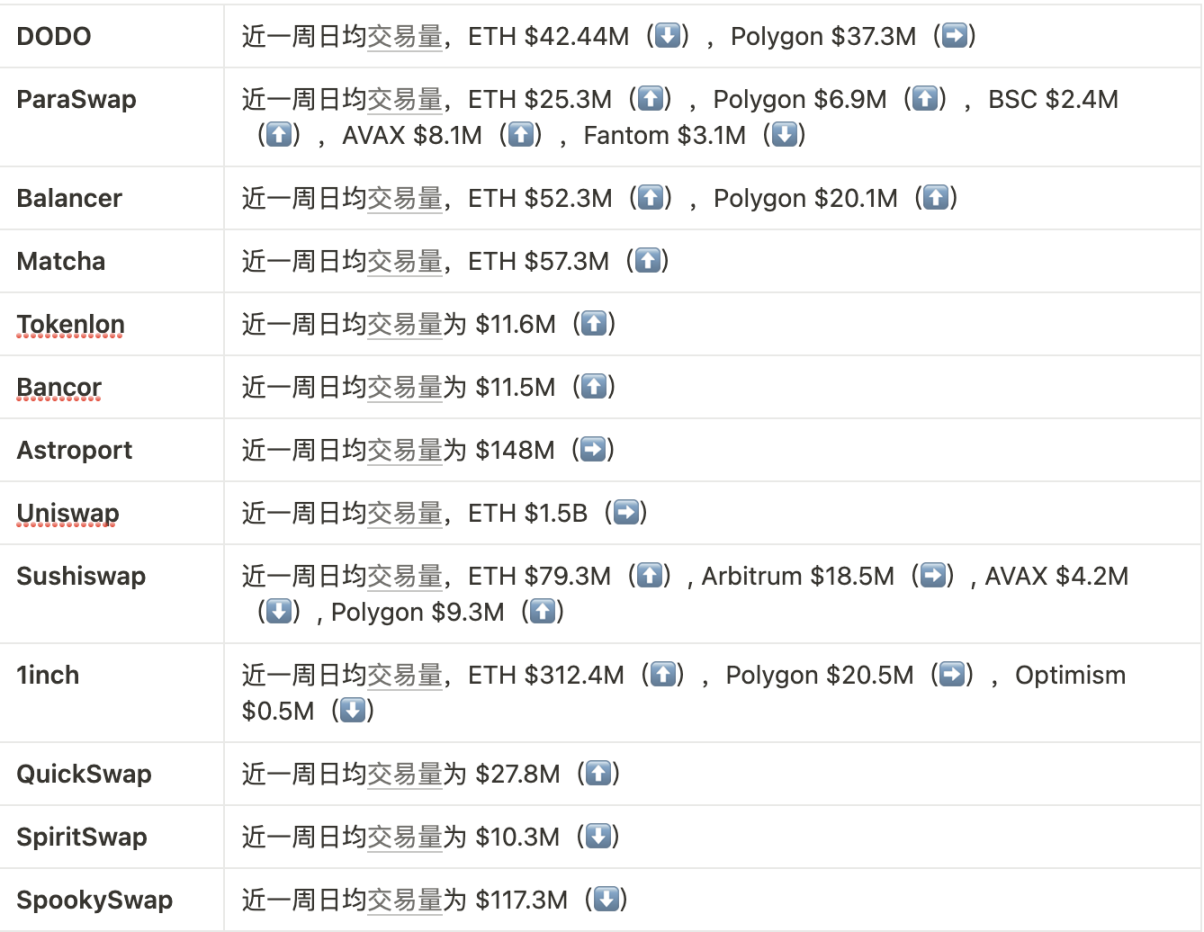 这周 DEX 上的交易量相比上周稍有回弹。本次 Dr.DODO 追踪的平台中, ParaSwap、 Balancer、 Match、 Sushiswap、 1inch、 QuickSwap 交易量小幅上涨,而 DODO、 SpiritSwap、 SpookySwap 等 DEX 的交易量略有下降,Astroport 和 Uniswap 的交易量持平。