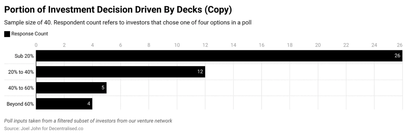 在撰写这篇文章之前,我向两组投资者提出了同样的问题:「在种子阶段,你的投资决策中有多少是由 PPT 决定的?」回答各不相同。Primitive Ventures 的 Dovey Wan 在我们的风险投资社区中指出,种子阶段的投资就像第一次约会,主要是凭感觉。Multicoin 的 Kyle Samani 则认为,大部分筹资是关于沟通,而 PPT 是传达这一点的主要工具。