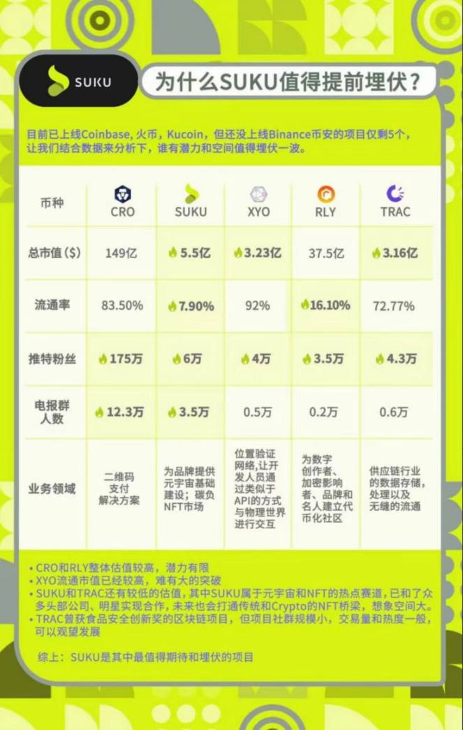 目前SUKU上了Coinbase,Huobi,Kucoin等头部交易, 但还没上币安,同类条件的项目,我们筛选了下仅剩5个了。我们制作了一个图表详细分析了这5个项目的优劣,论证了为什么SUKU是其中最有潜力的,供大家参考。