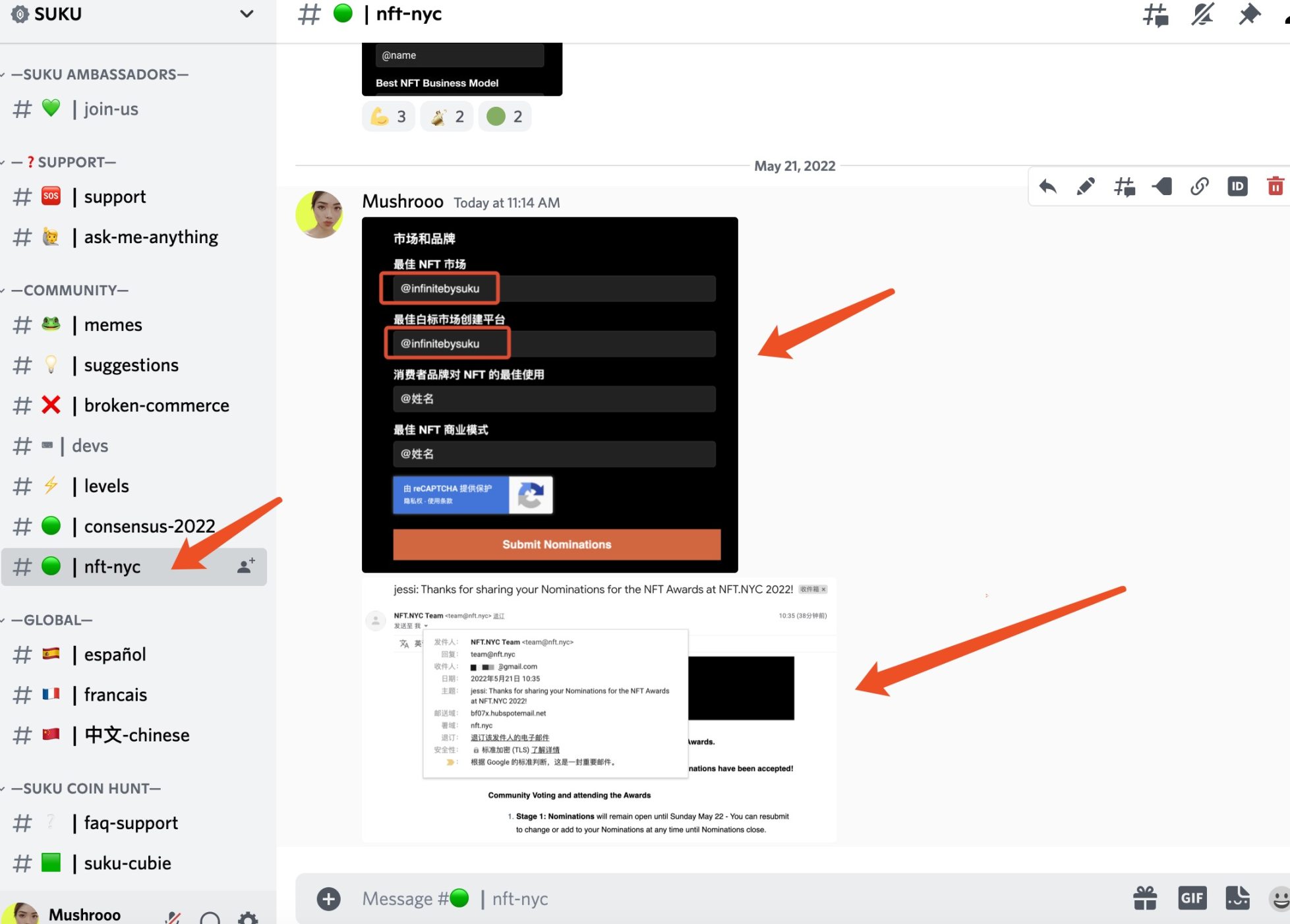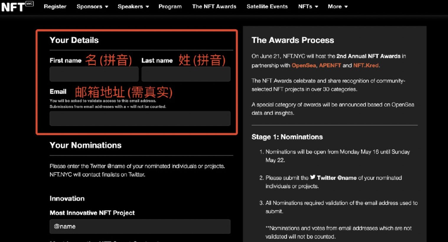 3)中间的所有空直接略过,将网页拉到底部,提名SUKU Infinite:在Best NFT Marketplace 和 Best White label marketplace creation platform两个空填写@infinitebysuku。