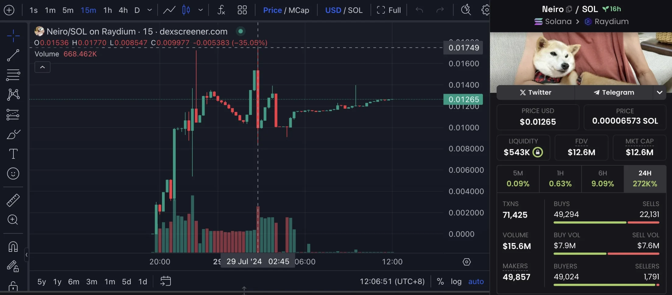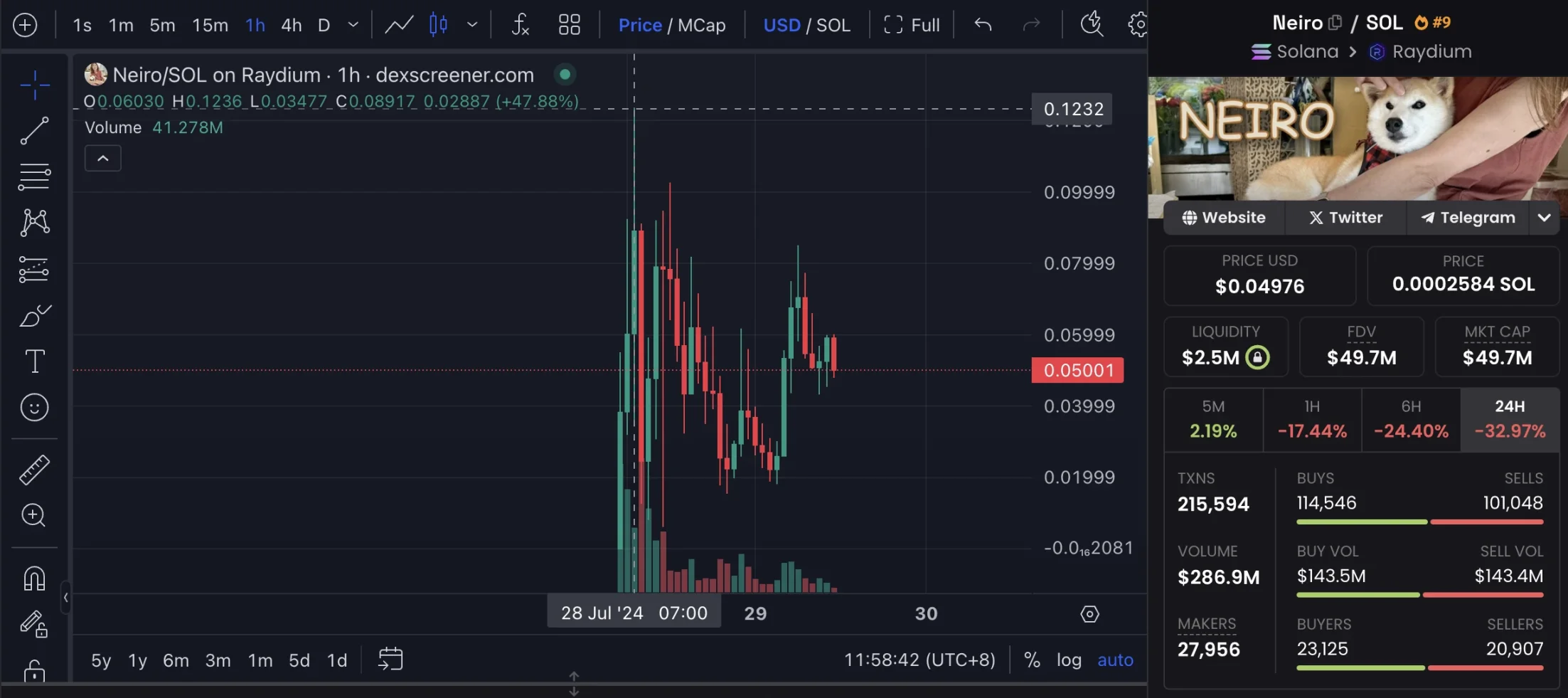 Solana 生态的第一个 Neiro 代币合约部署于凌晨 5 点之后,可以说是反应最快的「Meme 币项目」。截止撰稿时,代币价格为 0.049 美元左右,市值为 4970 万美元,高点价格一度突破 0.12 美元。