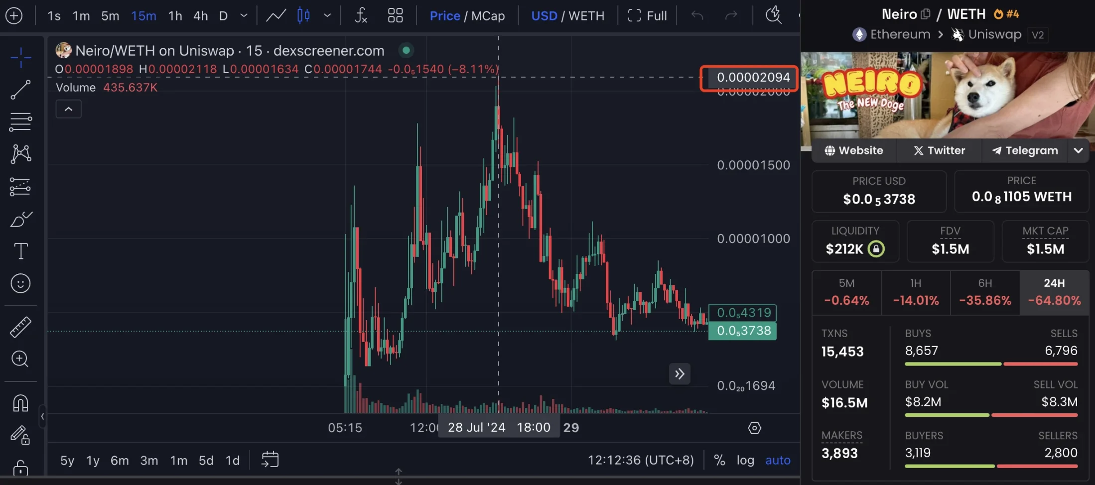 以太坊生态的 Neiro 代币合约部署于昨天凌晨 5 点 15 分左右。截止撰稿时,代币价格为 0.000003691 美元左右,市值为 150 万美元,高点价格一度突破 0.00002 美元,但目前 24 小时跌幅已超 65% ,有归零的迹象。
