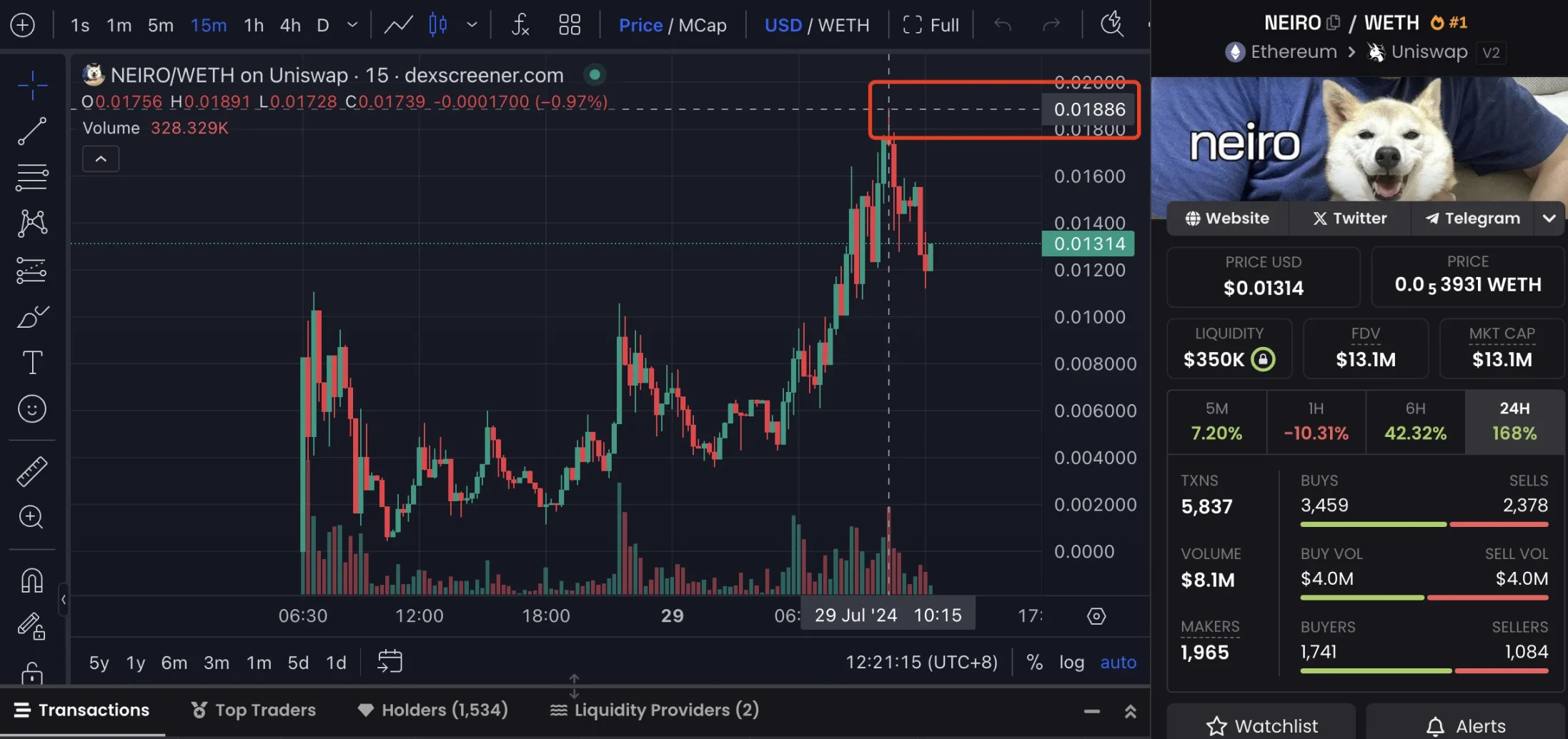 短短的一天左右的时间,Neiro 的出现再次为 Meme 币市场带来了新的活力,也带来了新的「暴富故事」——