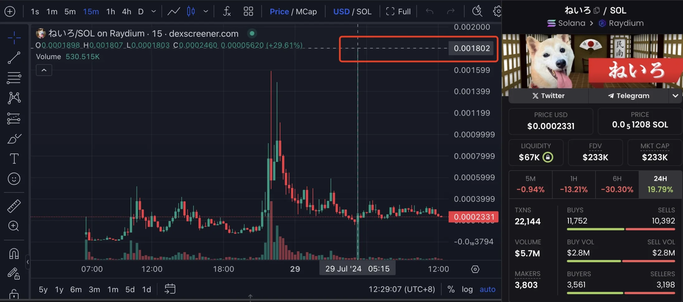 基于 pump.fun 平台发布的 Solana 生态 Meme 币 ねいろ(日语直译为音色)也被视为新柴犬的象征符号。截止撰稿时,代币价格为 0.00023 美元左右,市值为 23.3 万美元,高点价格曾一度拉升突破至 0.0018 美元,目前已大幅回落,但有不少人因其「更原汁原味」而采取了埋伏操作。