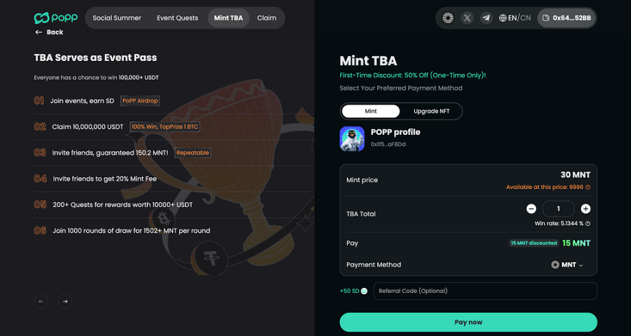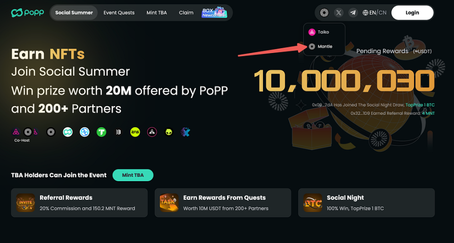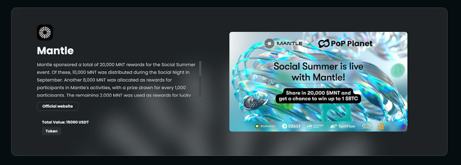 PoPP will sponsor a total of 20,000 MNT for this SocialSummer event: 10,000 MNT will be distributed on social night; 8,000 MNT will be used for lucky draws to users who have completed all tasks (1,000 people); 2,000 MNT will be distributed to all users who have minted TBA (please follow PoPP’s official release for specific distribution methods).