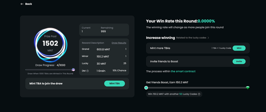 You can choose to invite new users to Mint TBA on Mantle to increase your chances of winning in the thousand-round lottery and get a 20% refund of the Mint fee, which will be refunded in the form of MNT, unlimited times, and you can withdraw it at any time.