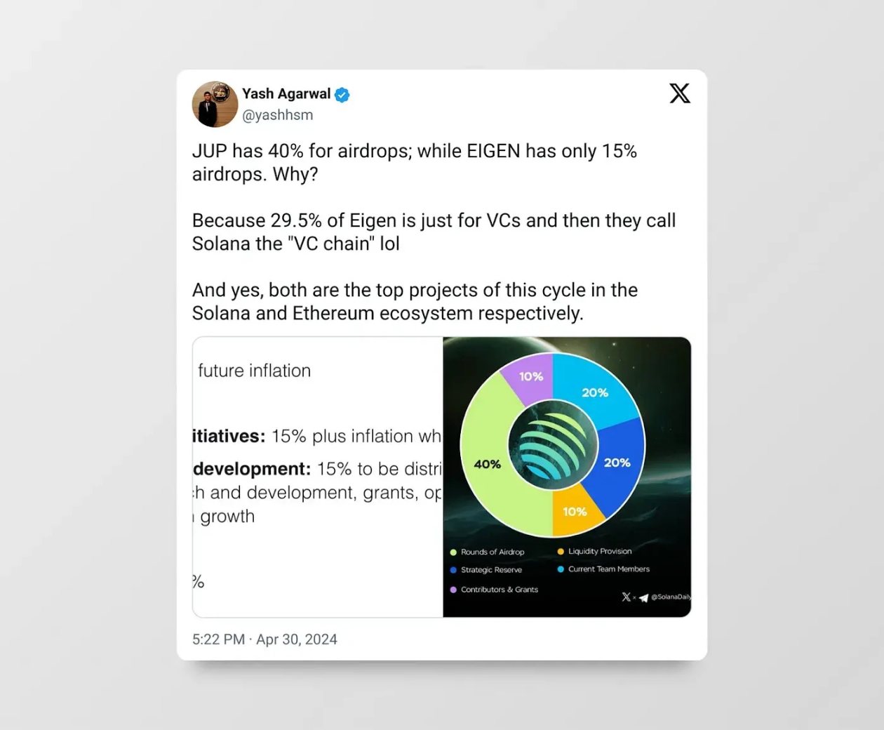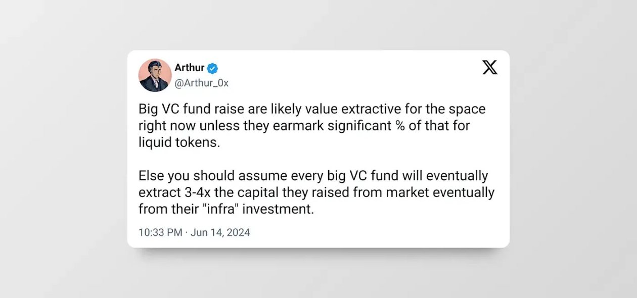 散户的反 VC 投资情绪是有原因的;他们觉得资金充沛的 VC=更高的 FDV,更低流通代币的基础设施。